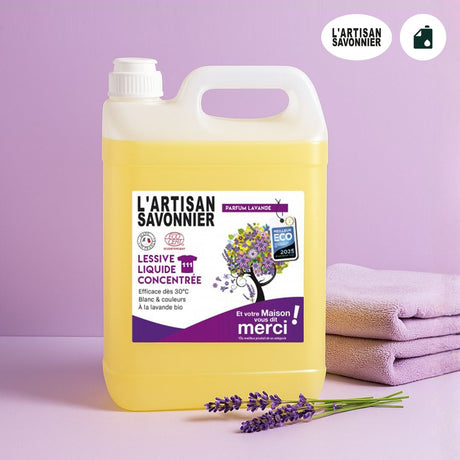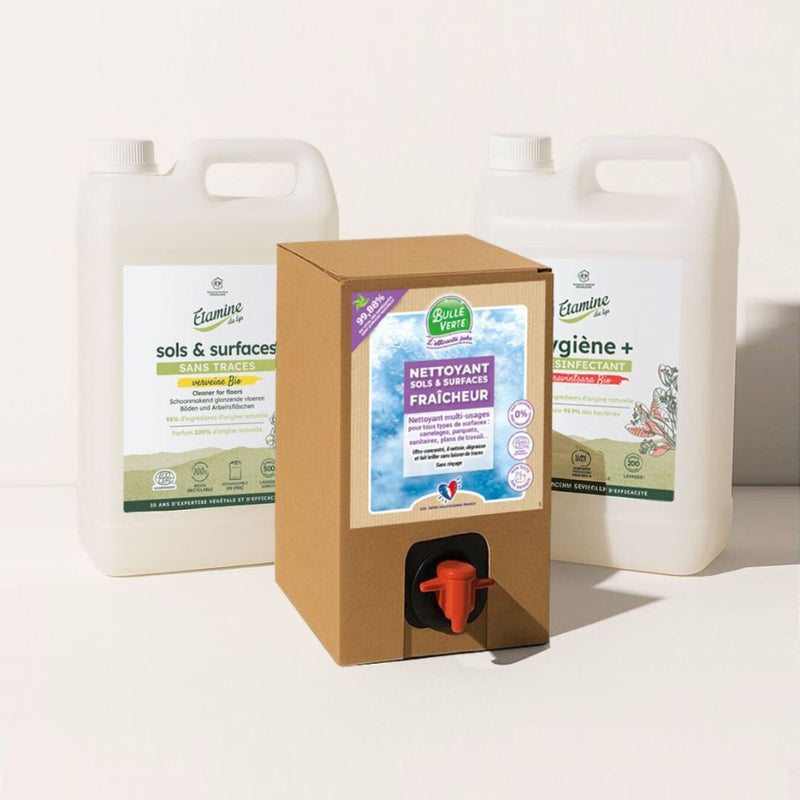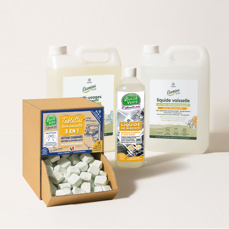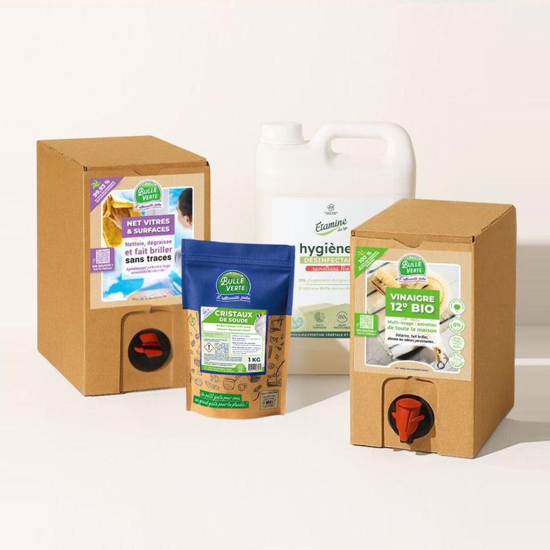 Vinaigres ménagers 12°/14°, lessives Ecocert en format 3L/10L, liquide vaisselle en conditionnement XXL : nos produits d'entretien grand format offrent efficacité naturelle sans multiplier les flacons.