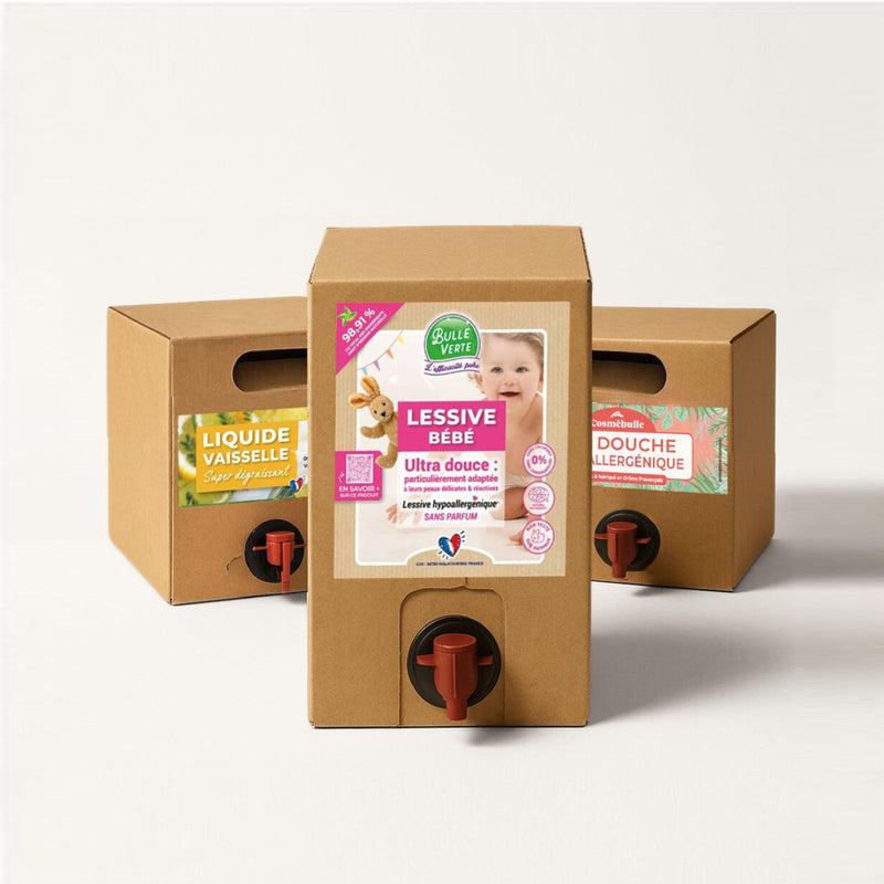 Notre technologie Bag-in-Box (85 % carton FSC) réduit de 80 % le plastique utilisé dans nos emballages. Empreinte carbone : seulement 0,08kg de CO2/L — inégalable !