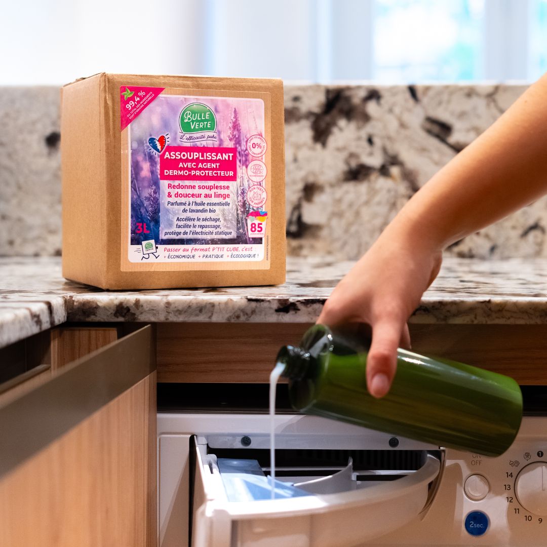 Cet assouplissant liquide à la lavande adoucit le linge tout en réduisant l’électricité statique et en accélérant le séchage. Parfumé à l’huile essentielle de lavandin bio, il protège les peaux sensibles grâce à un agent dermo-protecteur. Efficace dès 30°C, même en cycle court.
